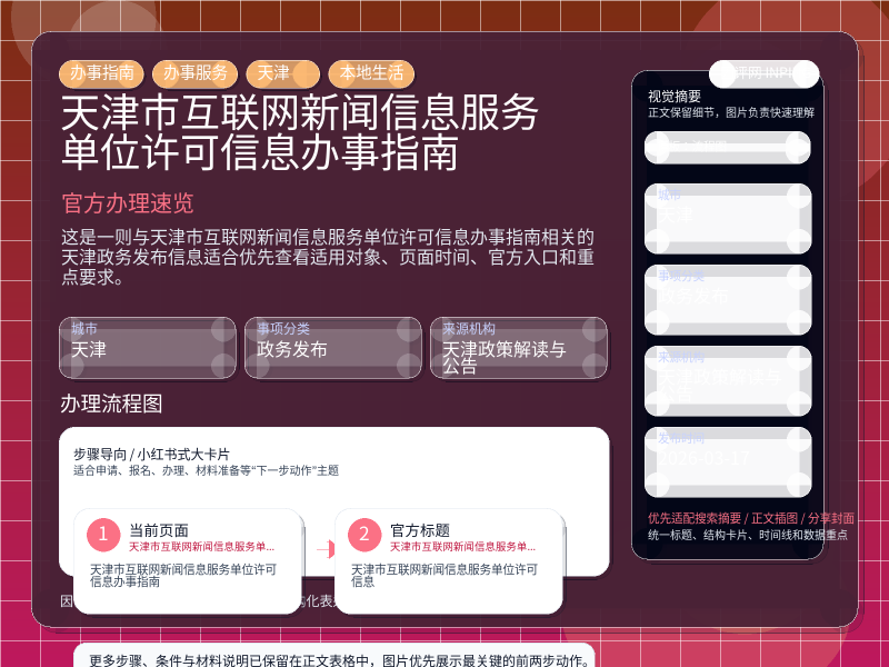 天津政务发布整理,围绕“天津市互联网新闻信息服务单位许可信息”提炼为可检索、可阅读的原创结构化内容,优先展示时间、对象、入口和行动建议,来源:天津政策解读与公告。