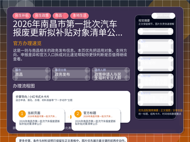 | 2026年南昌市第一批次汽车报废更新拟补贴对象清单公示 | 政策申请人与民生福利关注人群 | 适用对象、申领条件和申报入口 | 先确认条件、金额和申报时间 | 查看原文 |