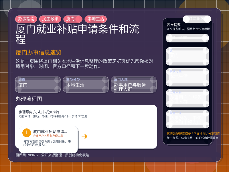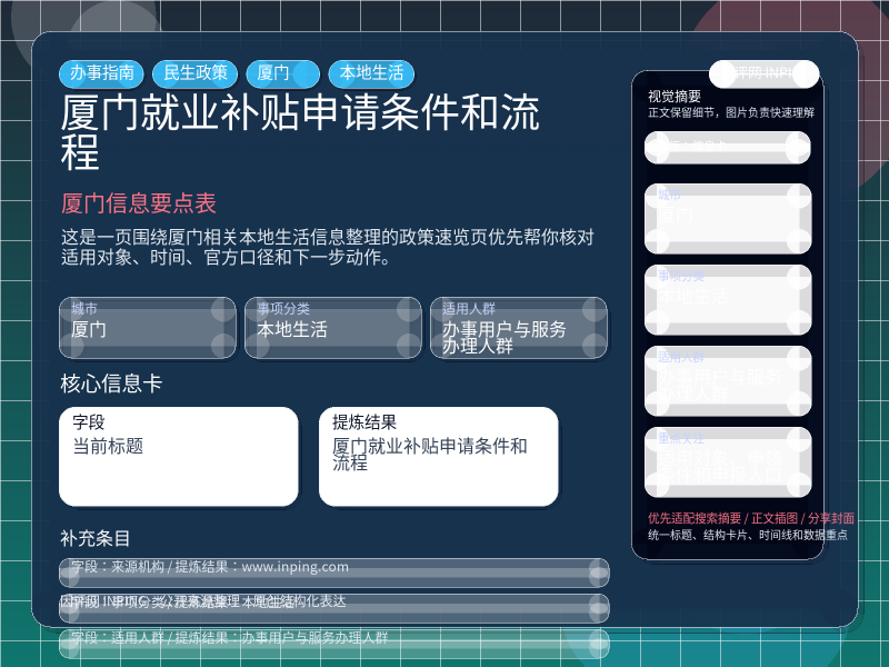 这项信息由 www.inping.com 发布,围绕“厦门就业补贴申请条件和流程”整理为政策速览页。进入页面后,先核对适用对象、时间和官方口径,再看适用对象、申领条件和申报入口。