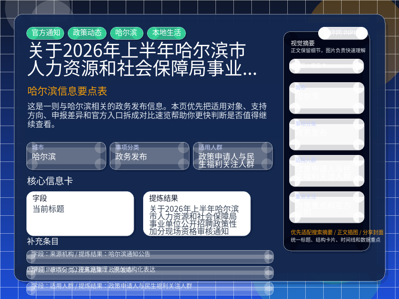 哈尔滨政务发布整理,围绕“关于2026年上半年哈尔滨市人力资源和社会保障局事业单位公开招聘政策性加分现场资格审核通知”提炼为可检索、可阅读的原创结构化内容,优先展示时间、对象、入口和行动建议,来源:哈尔滨通知公告。
