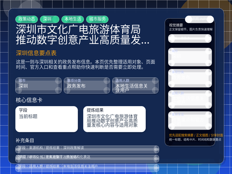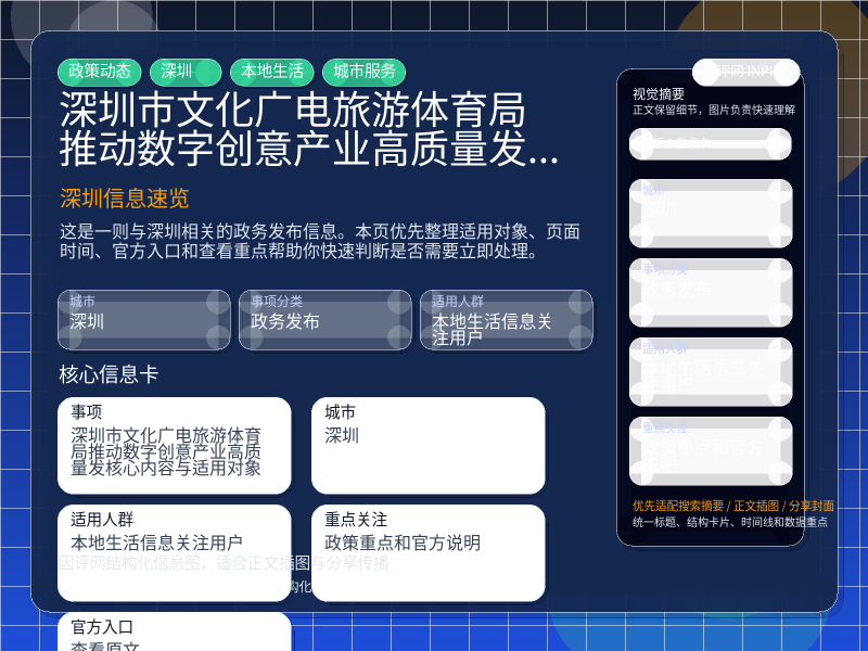 深圳政务发布整理,围绕“《深圳市文化广电旅游体育局推动数字创意产业高质量发...”提炼为可检索、可阅读的原创结构化内容,优先展示时间、对象、入口和行动建议,来源:深圳政策解读。