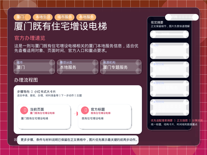 厦门本地服务整理,围绕“既有住宅增设电梯”提炼为可检索、可阅读的原创结构化内容,优先展示时间、对象、入口和行动建议,来源:厦门专题服务。