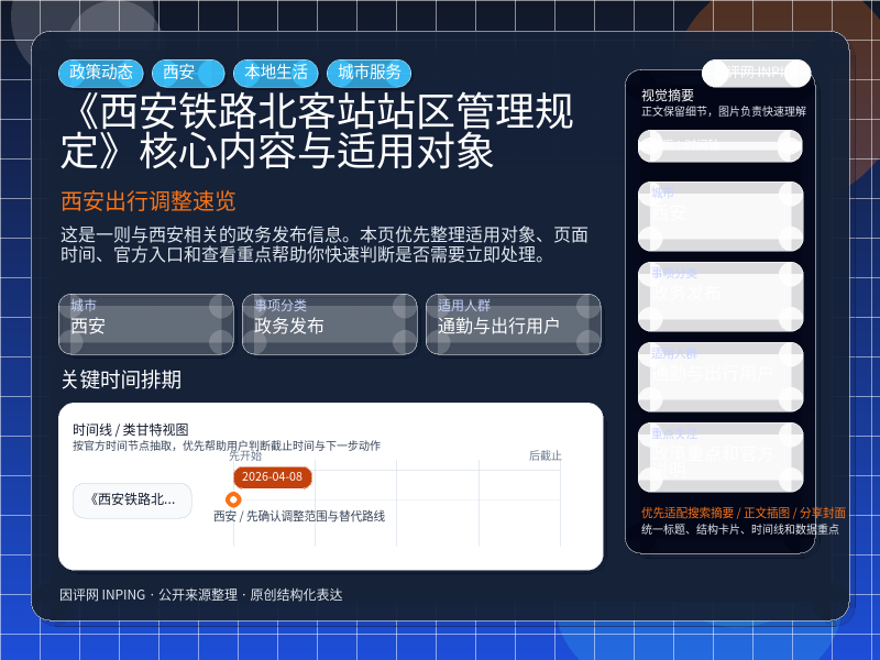 这条信息当前更适合 通勤与出行用户 重点关注。如果你正准备处理“《西安铁路北客站站区管理规定》核心内容与适用对象”相关事项,建议先结合自身身份、所属行业或所在区域判断是否属于适用对象。
