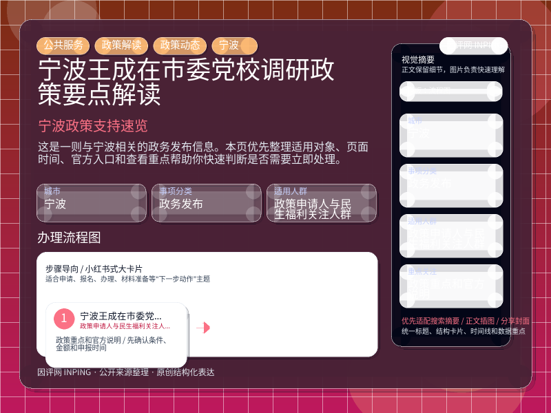 这项信息由 宁波政务公开 发布,围绕“宁波王成在市委党校调研政策要点解读”整理为便于直接查看的本地生活页。进入页面后,先看自己是否属于适用对象,再看政策重点和官方说明。