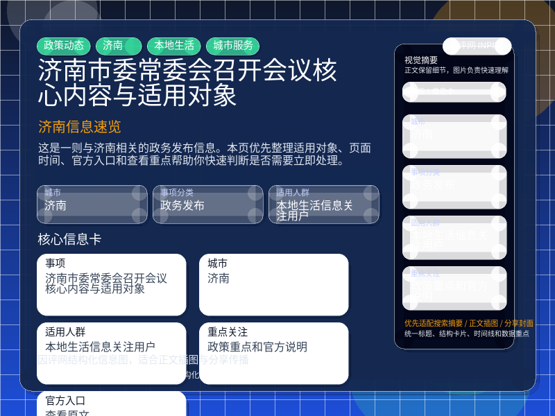 这条信息当前更适合 本地生活信息关注用户 重点关注。如果你正准备处理“济南市委常委会召开会议核心内容与适用对象”相关事项,建议先结合自身身份、所属行业或所在区域判断是否属于适用对象。