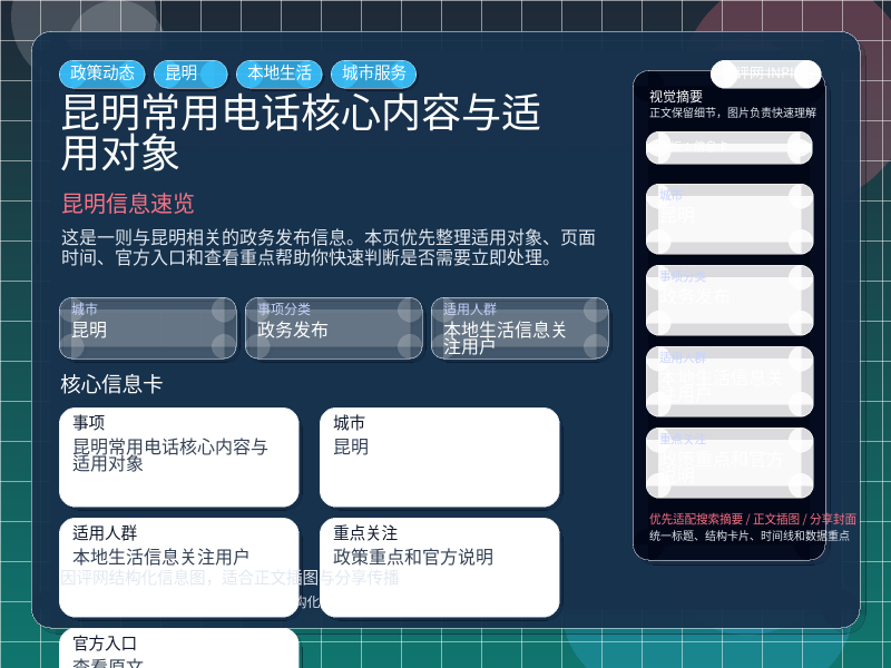 这项信息由 昆明政府网首页聚合 发布,围绕“昆明常用电话核心内容与适用对象”整理为便于直接查看的本地生活页。进入页面后,先看自己是否属于适用对象,再看政策重点和官方说明。