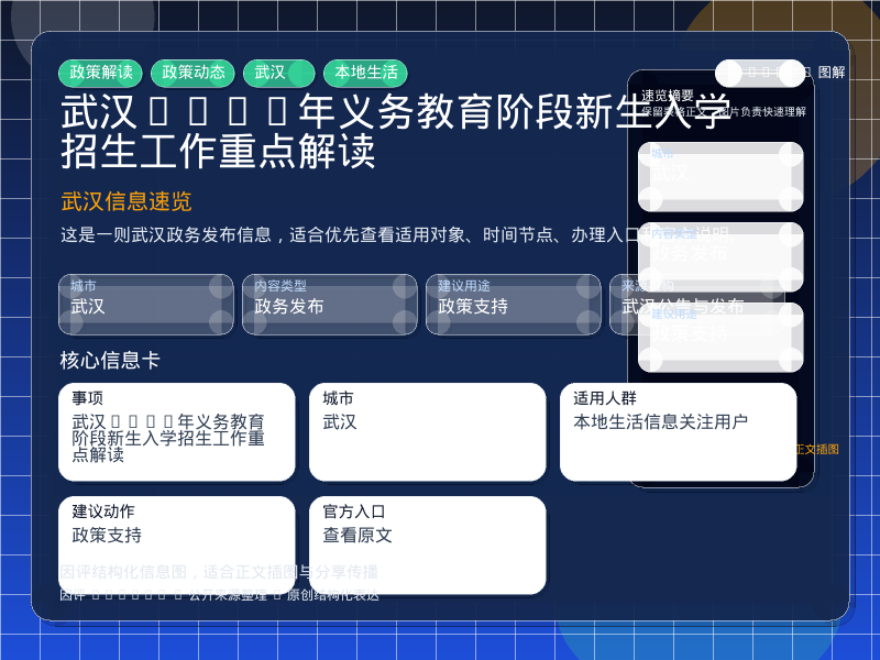 核心结论武汉政务发布整理,围绕“市教育局关于做好2026年义务教育阶段新生入学招生工作的通知”提炼为可检索、可阅读的原创结构化内容,优先展示时间、对象、入口和行动建议,来源:武汉公告与发布。