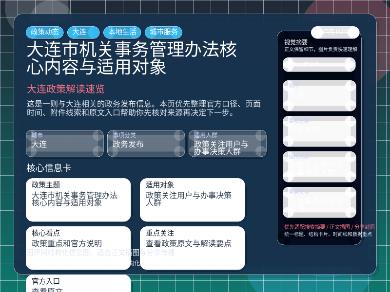 这项信息由 大连政府规章库 发布,围绕“大连市机关事务管理办法核心内容与适用对象”整理为官方口径优先的本地生活页。进入页面后,先核对原文入口、页面时间和附件,再看政策重点和官方说明。